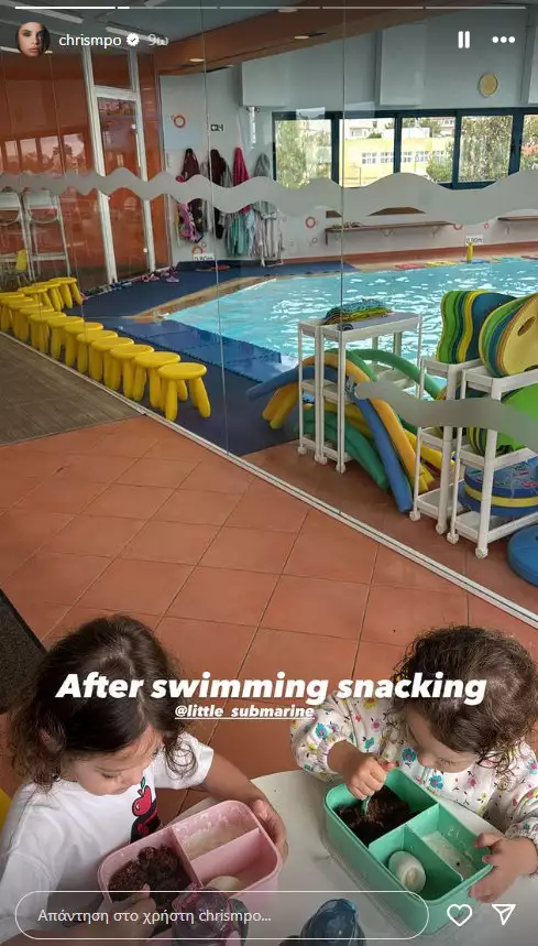 Αυτή τη φορά, η Χριστίνα Μπόμπα παρακολούθησε τα μαθήματα κολύμβησης που έκαναν η Αριάνα και η Φιλίππα στο κολυμβητήριο.