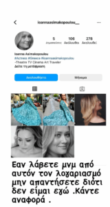Όπως αναφέρει χαρακτηριστικά μάλιστα, η Ιωάννα Ασημακοπούλου, ο διαχειριστής του ψεύτικου προφίλ ζητούσε από τους ακόλουθούς του να μπουν σε κάποια Link για να βοηθήσουν την ηθοποιό να ανακτήσει το προφίλ της στα social media.