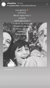 «Δύο χρόνια 12.09.22. – Θα σε πάρω στις 11:00 μπαμπά – Καλή ώρα είναι 11:00… 9;15 έφυγε το πλοίο, 9;15 έφυγες κι εσύ. Ήμασταν μαζί στη θάλασσα. Τραγουδούσα», έγραψε στην ανάρτησή της.