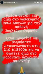 «Άμεση ανάγκη για αίμα στο νοσοκομείο Ιασώ Αθηνών για την ασθενή Σουλτάνη Ουρανία. Όσοι μπορείτε να βοηθήσετε επικοινωνήστε στο 210 6184006 για να δώσετε αίμα στο παραπάνω όνομα της ασθενούς», έγραψε χαρακτηριστικά ο Γιώργος Αγγελόπουλος.