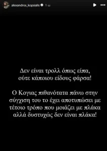 Σε ανάρτησή του στο Instagram ο Αλέξανδρος Κοψιάλης γράφει χαρακτηριστικά. «Δεν είναι τρολλ όπως είπα, ούτε κάποιου είδους φάρσα. Ο Κόγιας πιθανότατα πάνω στη σύγχισή του το έχει αποτυπώσει με τέτοιο τρόπο που μοιάζει με πλάκα, αλλά δυστυχώς δεν είναι πλάκα».