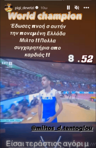 Η πρώην πρωταθλήτρια στον στίβο Πηγή Δεβετζή, αποθεώνει τον Μίλτο Τεντόγλου μέσω του προσωπικού της λογαριασμού στο Instagram.