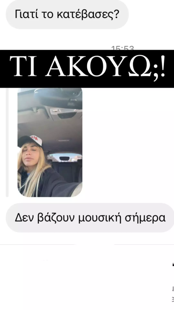«Δε βάζουν μουσική σήμερα» υπογράμμισε χαρακτηριστικά ο συγκεκριμένος ακόλουθος στην κόρη του Λευτέρη Πανταζή, με την ίδια να αναρτά το εν λόγω σχόλιο στα stories της γράφοντας «Τι ακούω;!».
