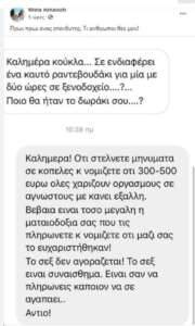 Από την πλευρά της, απάντησε «Καλημέρα, ότι στέλνετε μηνύματα σε κοπέλες για το ότι με 300-500 όλες χαρίζουν οργασμούς σε αγνώστους, με κάνει έξαλλη. Βέβαια είναι τόσο μεγάλη η ματαιοδοξία σας που τις πληρώνετε και νομίζετε ότι μαζί σας το ευχαριστήθηκαν. Το σεξ δεν αγοράζεται, το σεξ είναι συναίσθημα. Είναι σαν να πληρώνεις κάποιον να σε αγαπάει… Αντίο».