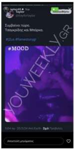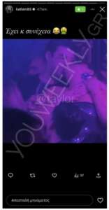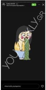 Σε αυτές, η ίδια είχε κοινοποιήσει τη φωτογραφία στην οποία Τσαγκρίδης και Μπάρκα φιλιούνται σε γνωστό club του κέντρου της Αθήνας μαζί με ένα emoji εμετού, ενώ λίγο αργότερο προχώρησε στην κοινοποίηση ακόμα ενώς gif με ένα ανθρωπάκι που φαίνεται να κάνει εμετό.