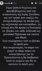 «Είμαι βαθιά θιγμένος και προσβεβλημένος από την ανακοίνωση της Ιεράς Συνόδου και τον τρόπο που νομλιζει ότι αντιμετωπίζουμε τα παιδιά μας, ως “αξεσουάρ και κατοικίδια”, τη στιγμή που θα πρέπει η Εκκλησία να βλέπει τον κάθε άνθρωπο ως μοναδικό πρόσωπο και εικόνα του θεού.