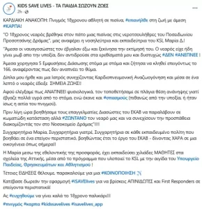 Τις αγωνιώδεις προσπάθειες διάσωσης μετέφερε μέσω της ανάρτησης η εκπαιδεύτρια του «Kids Save Lives», Μαρία Δρίτσα, αφότου ο 18χρονος βρέθηκε στον βυθό της πισίνας.