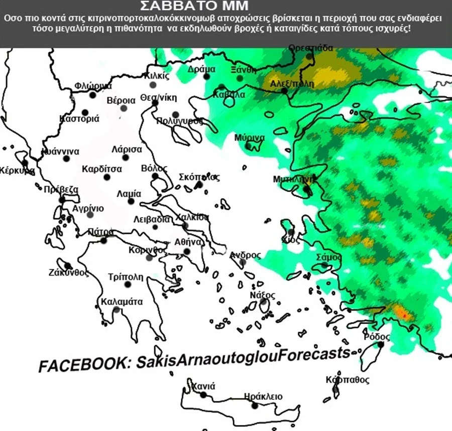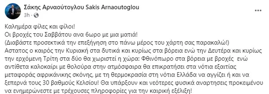 Ο εγκεκριμένος μετεωρολόγος Σάκης Αρναούτογλου μέσω μίας ανάρτησης του στο Facebook προειδοποιεί πως στα βόρεια μέρη της χώρας αναμένεται να βιώσουμε το «φθινόπωρο» με την εμφάνιση βροχών και μείωση της θερμοκρασίας. Αντίθετα, στα νότια, προβλέπεται να επικρατήσει «καλοκαίρι» με θερμοκρασίες που φτάνουν τους 30 βαθμούς Κελσίου, αλλά και την παρουσία αφρικανικής σκόνης.