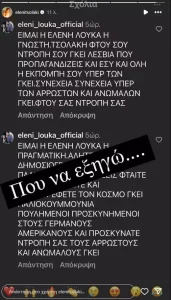 Κάτω από αναρτήσεις της παρουσιάστριας στο instagram, η Ελένη Λουκά στράφηκε κατά της Ελένης Τσολάκη και των συνεργατών της οι οποίοι όπως αναφέρει, είναι υπέρ των ομόφυλων ζευγαριών, με αφορμή τα θέματα που προβάλλονται καθημερινά στην πρωινή εκπομπή του Open.