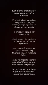 Δεν είναι επίθεση αυτό το μήνυμα, είναι λύπη. Μια λύπη που δεν χωράει σε λέξεις. Κι αν νιώσεις έστω και λίγο άβολα διαβάζοντάς του, ίσως αυτό είναι το πρώτο φως. Ίσως η Ανάσταση που έχουμε ανάγκη δεν είναι ενός Θεού… Αλλά της συνείδησής μας» έγραψε η Γιάννα Τερζή.