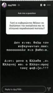 Στη συνέχεια σε ερώτηση των ακόλουθών του, «γιατί οι κυβερνώντες θέλουν να διαλύσουν την οικογένεια και τα ελληνικά πιστεύω» ο Γιαννακόπουλος απάντησε: «Δεν είναι θέλω των κυβερνώντων πάει πολύ πιο βαθιά. Διότι μόνο η Ελλάδα και ο Ελληνισμός τους φοβίζει».
