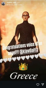 Ειδικότερα η περσινή εκπρόσωπος της Ελλάδας στον Ευρωπαϊκο Διαγωνισμό Τραγουδιού δημοσίευσε ένα βίντεο σε story στον λογαριασμό της στο Instagram. Όπου μεταφέρει τα συγχαρητήριά της στην Klavdia για την επίδοσή της και για τη χαρακτηριστική φωνή αγγέλου. «Συγχαρητήρια, φωνή ενός αγγέλου», έγραψε. Ενώ την ιστορία της συνόδευε ο ήχος της Αστερομάτας.