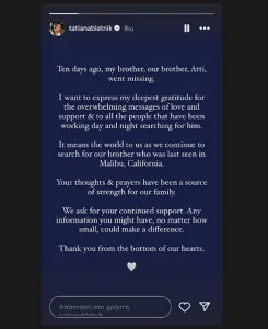 «Πριν από δέκα μέρες χάθηκε ο αδελφός μου, ο αδελφός μας, ο Άττι. Θέλω να εκφράσω τη βαθύτατη ευγνωμοσύνη μου για τα συντριπτικά μηνύματα αγάπης και υποστήριξης και σε όλους τους ανθρώπους που εργάζονται μέρα και νύχτα αναζητώντας τον.