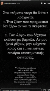 Συγκεκριμένα, το story της γράφει: «Στο επόμενο story θα δείτε 2 πράγματα: 1. Ένα ζώον που πραγματικά δεν ξέρω αν και τι σκέφτεται. 2. Τον “λόγο” που δέχτηκα επίθεση με βιτριόλι. Αν μου ξανά ρίξουν μην ψάχνετε ποιος και τι και κάνετε σενάρια επιστημονικής φαντασίας. Υ.Γ Είναι ένα παράδειγμα από τα πολλά. Μια απογοήτευση γενικά. Όλοι γνωρίζουν τι έχω τραβήξει αλλά μερικοί τον χαβά τους».