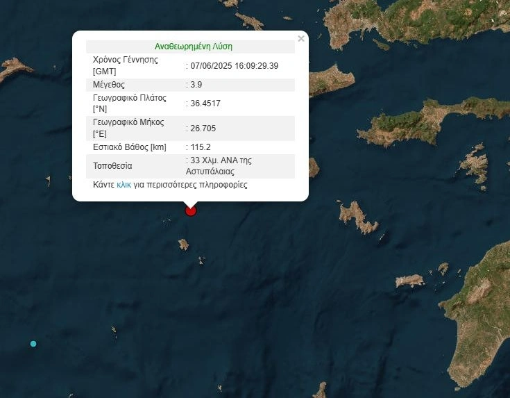 Σύμφωνα με τα στοιχεία του Γεωδυναμικού Ινστιτούτου της Αθήνας, το επίκεντρο εντοπίστηκε στα 33 χιλιόμετρα ανατολικά-νοτιοανατολικά της Αστυπάλαιας.