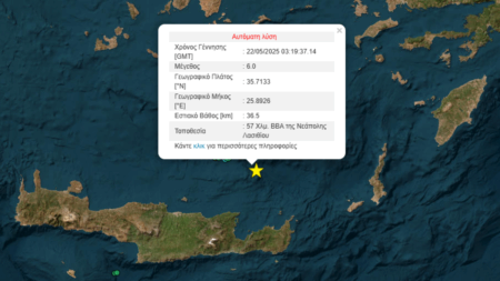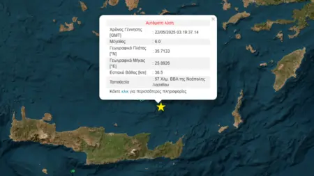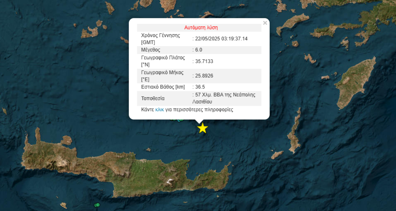 Σύμφωνα με τα πρώτα στοιχεία το επίκεντρο του σεισμού εντοπίστηκε 57 χλμ. βόρεια της Νεάπολης Λασιθίου στην Κρήτη.