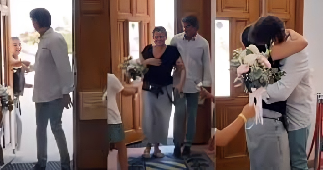 Το ζευγάρι αγκαλιάζεται σφιχτά και εκείνη προχωρά να χαιρετήσει τα αγαπημένα της πρόσωπα με ένα λαμπερό χαμόγελο.