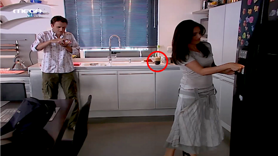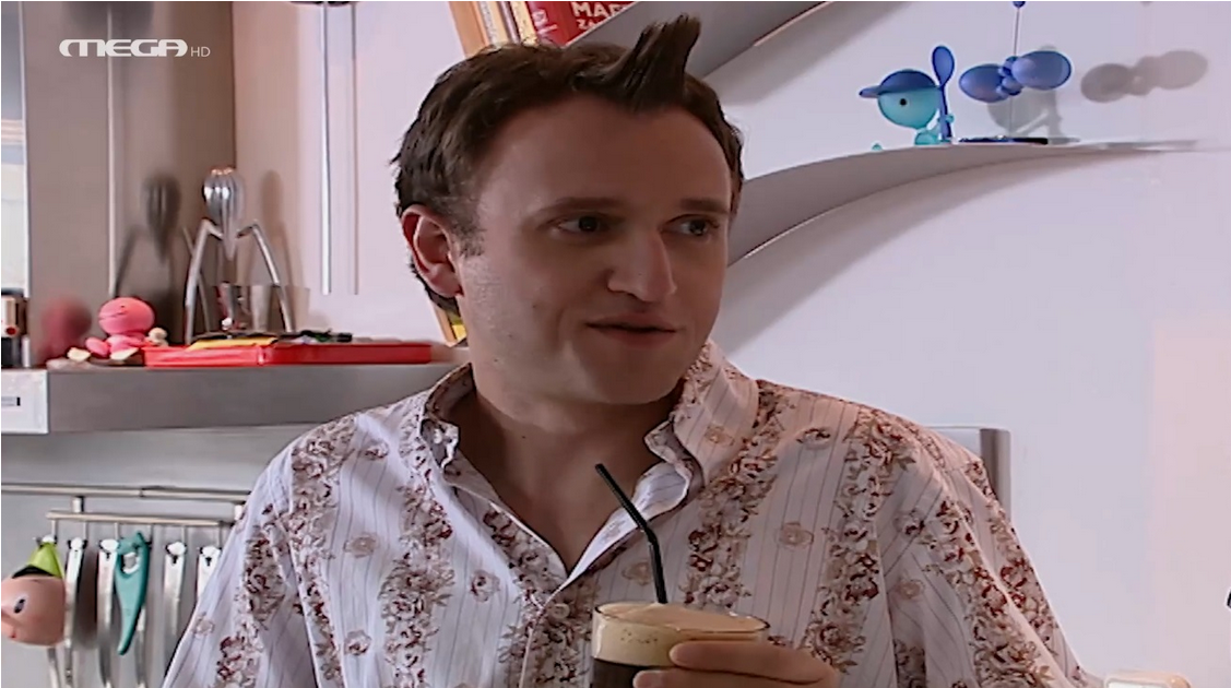 Ο Φώτης παίρνει στα χέρια του τον φραπέ και στο κοντινό του πλάνο βλέπουμε τον καημένο τον φραπέ να έχει ξαναχάσει τον αφρό του δημιουργώντας ένα τυπικό τηλεοπτικό σκηνογραφικό παράδοξο.