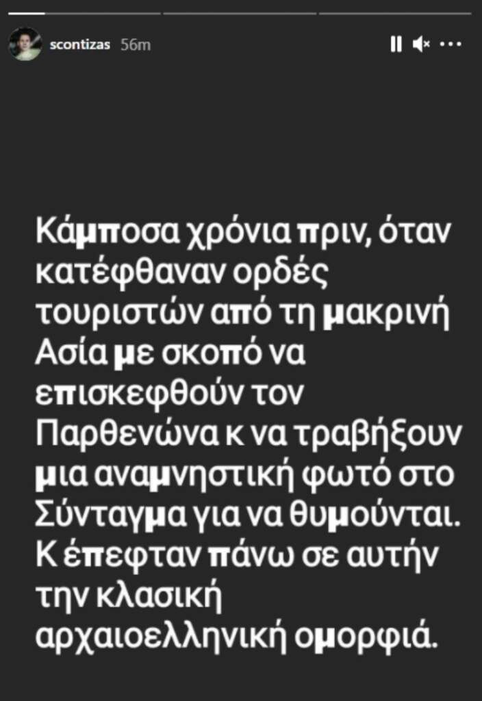«Κάμποσα χρόνια πριν, όταν κατέφθαναν ορδές τουριστών από τη μακρινή Ασία με σκοπό να επισκεφθούν τον Παρθενώνα κ να τραβήξουν μια αναμνηστική φωτό στο Σύνταγμα για να θυμούνται. Κ έπεφταν πάνω σε αυτήν την κλασική αρχαιοελληνική ομορφιά», έγραψε ο Σωτήρης Κοντιζάς στο Instagram αστειευόμενος σχετικά με την εμφάνισή του.