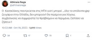 «Ο Κασσελάκης παντρεύεται στις ΗΠΑ γιατί μπορεί …όλα τα υπόλοιπα gay ζευγάρια στην Ελλάδα, δεν μπορούν! Θα περίμενα για λόγους συμβολικούς να συμμεριστεί το πρόβλημα και να περιμένει. Ωστόσο να ζήσουν», έγραψε.