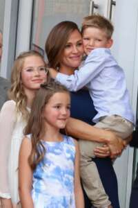 Η Τζένιφερ Γκάρνερ σε φωτογράφιση του 2018, με τα παιδιά της Βάιολετ, Σεραφίνα και Σαμ