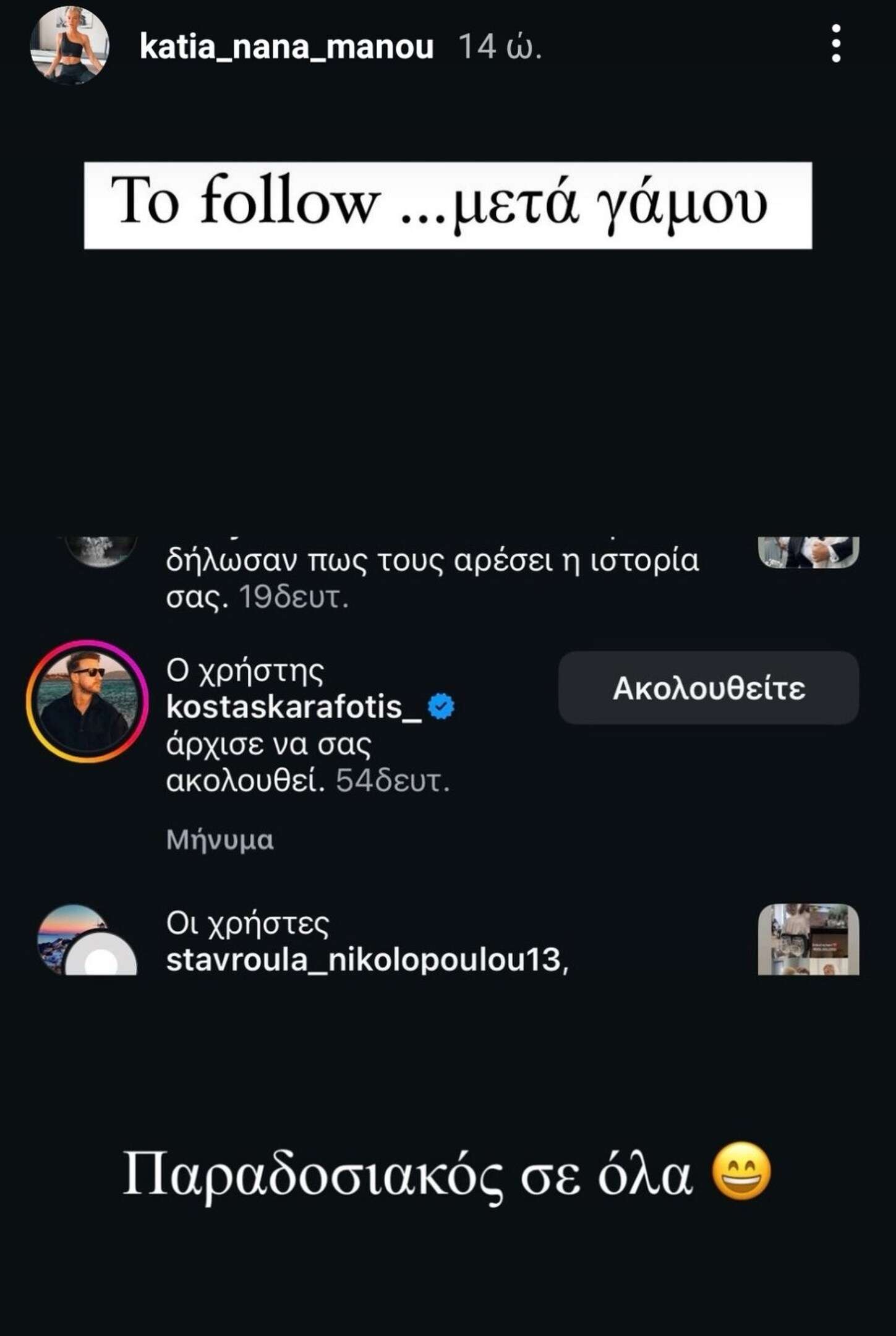 Οι αναρτήσεις της Κάτιας Μάνου και η αποκάλυψη που έκανε για τον Κώστα Καραφώτη και το follow μετά τον γάμο τους.