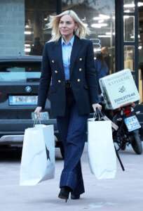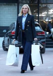 Η γνωστή παρουσιάστρια επέλεξε ένα ψηλόμεσο μπλε τζιν σε straight γραμμή, το οποίο συνδύασε με ένα μπλε πουκάμισο και ένα σικ navy blue σακάκι με λαμπερά χρυσά κουμπιά. Τα ψηλοτάκουνα μποτάκια και η ζώνη Gucci ολοκλήρωσαν το στυλ της, ενώ οι λαμπεροί χρυσοί κρίκοι πρόσθεσαν μια επιπλέον πινελιά στην σικάτη εμφάνισή της.
