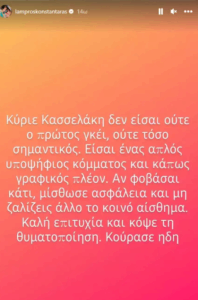 «Κύριε Κασσελάκη δεν είσαι ούτε ο πρώτος γκέι, ούτε τόσο σημαντικός. Είσαι ένας απλός υποψήφιος κόμματος και κάπως γραφικός πλέον. Αν φοβάσαι κάτι, μίσθωσε ασφάλεια και μη ζαλίζεις άλλο το κοινό αίσθημα. Καλή επιτυχία και κόψε τη θυματοποίηση. Κούρασε ήδη» έγραψε ο Λάμπρος Κωνσταντάρας.