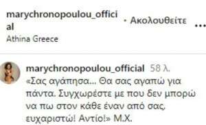 Μόλις λίγες ημέρες μετά τη δυσάρεστη είδηση του θανάτου της Μαίρης Χρονοπούλου, στην προσωπική σελίδα που διέτεθε στο Instagram «ανέβηκε» μια φωτογραφία, την οποία συνόδευε μια λεζάντα με τα λόγια που είχε ζητήσει να γραφτούν μετά το θάνατό της και μας σηκώθηκε η τρίχα.