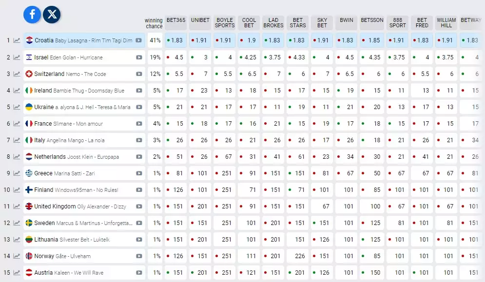 Μετά τη χθεσινή βραδιά, η κατάσταση των χωρών στα στοιχήματα άλλαξε ξανά, με την Κροατία να παραμένει το απόλυτο φαβορί, να ακολουθούν το Ισραήλ και η Ελβετία, ενώ με αρκετά μεγάλη διαφορά, η Ελλάδα φαίνεται να βρίσκεται στην ένατη θέση, σύμφωνα με τα επίσημα στοιχήματα.