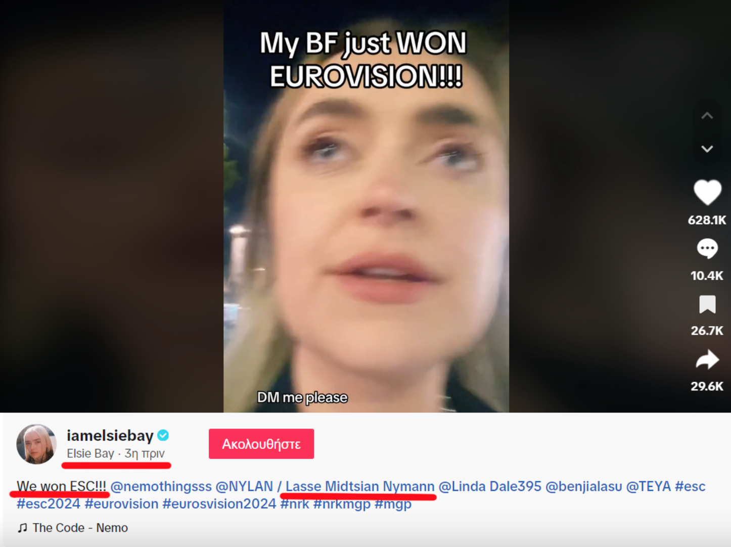 Ωστόσο, η Elsie Bay αναφερόταν στον σύντροφό της, τον Νορβηγό Lasse Midtsian Nymann, ο οποίος ήταν παραγωγός του τραγουδιού του Nemo και ένας από τους στιχουργούς του νικητήριου τραγουδιού «Break the Code». Η Elsie το παραδέχτηκε σε σχόλιο κάτω από το βίντεό της, αλλά τα ελληνικά σάιτ δημοσίευσαν άρθρα υποθέτοντας ότι εκείνη είναι η κοπέλα του Nemo.