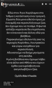 Το απόγευμα της Τρίτης 18 Ιουλίου και μέσω stories, ο Αλέξης Γεωργούλης αναδημοσίευσε στιγμιότυπα εθελοντών που προσφέρουν βοήθεια, αλλά και σελίδων που ζητούν βοήθεια σε ζώα.