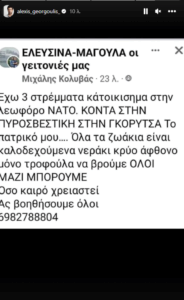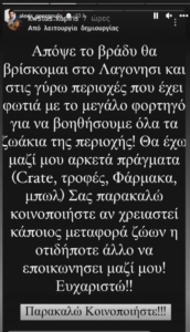 Το απόγευμα της Τρίτης 18 Ιουλίου και μέσω stories, ο Αλέξης Γεωργούλης αναδημοσίευσε στιγμιότυπα εθελοντών που προσφέρουν βοήθεια, αλλά και σελίδων που ζητούν βοήθεια σε ζώα.