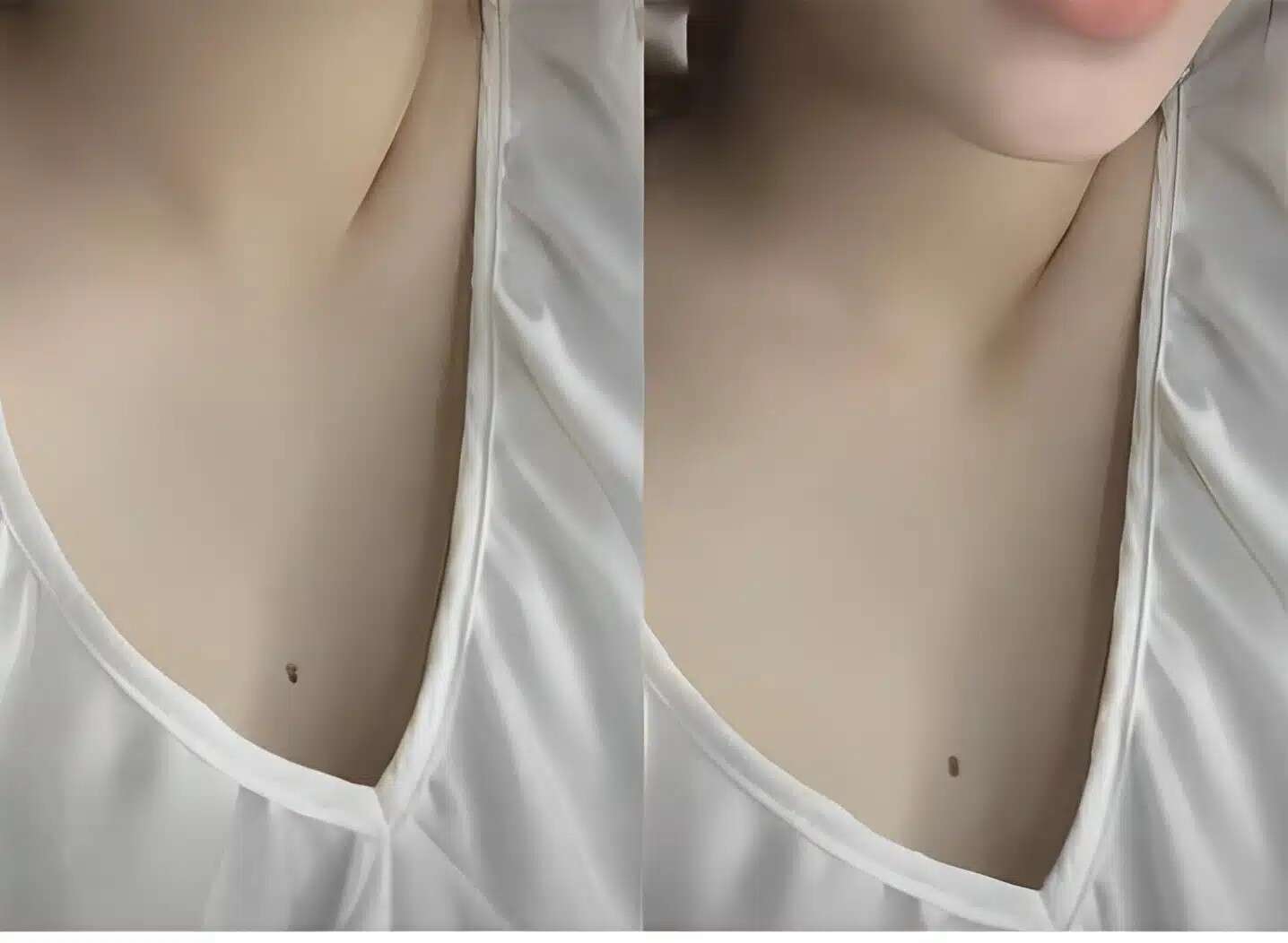 Ένας τυφλοπόντικας στο στήθος, που μεγαλώνει κάτω, συμβολίζει την τύχη, φέρνοντας χρήματα στον ιδιοκτήτη. Μια πλούσια και ευγενική ζωή. Συγκεκριμένα, οι άντρες είναι συχνά πολύ ερωτευμένοι με κορίτσια με κρεατοελιές σε αυτή τη θέση.