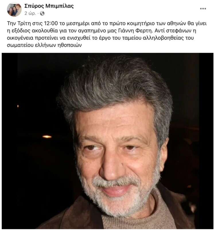 «Την Τρίτη στις 12:00 το μεσημέρι από το πρώτο κοιμητήριο των Αθηνών θα γίνει η εξόδιος ακολουθία για τον αγαπημένο μας Γιάννη Φέρτη. Αντί στεφάνων η οικογένεια προτείνει να ενισχυθεί το έργο του ταμείου αλληλοβοηθείας του σωματείου Ελλήνων ηθοποιών», έγραψε ο Σπύρος Μπιμπίλας για την κηδεία του Γιάννη Φέρτη.