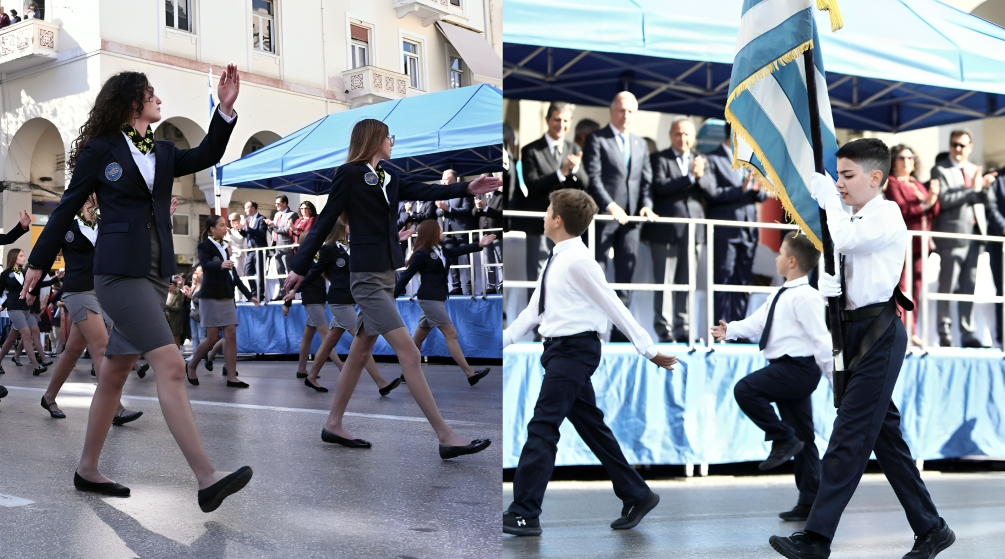 Οι μαθητές και οι μαθήτριες των σχολείων καταχειροκροτήθηκαν στη σημαιοστολισμένη οδό Τσιμισκή όπου με συγχρονισμένο βηματισμό τίμησαν τη θυσία των Ελλήνων πεσόντων υπό τους ήχους των εμβατηρίων από τη Φιλαρμονική Ορχήστρα του Δήμου Θεσσαλονίκης.