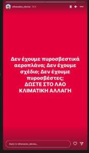 «Η Κιτσοπούλου μας μάρανε. Δεν ακούω “αίσχος, ντροπή”. Μας κακοποιήσατε. Για τόσα αίσχη που συμβαίνουν τα τελευταία χρόνια στη χώρα μας. Δύναμη στους ανθρώπους και στα ζώα. Δεν έχουμε πυροσβεστικά αεροπλάνα; Δεν έχουμε σχέδιο; Δεν έχουμε πυροσβέστες; Δώστε στον λαό κλιματική αλλαγή» έγραψε στην ανάρτησή του ο Θανάσης Αλευράς.