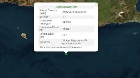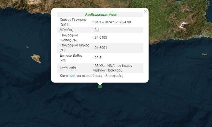 Όσον αφορά στον σεισμό στην Κρήτη, σημειώθηκε ένα λεπτό πριν από τις 8 το βράδυ, 36 Χλμ ΝΝΔ των Καλών Λιμένων Ηρακλείου, με εστιακό βάθος 22 χλμ.
