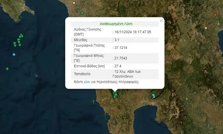 Σεισμική δόνηση μεγέθους 3,1 Ρίχτερ σημειώθηκε το βράδυ του Σαββάτου ανατολικά των Γαργαλιάνων.