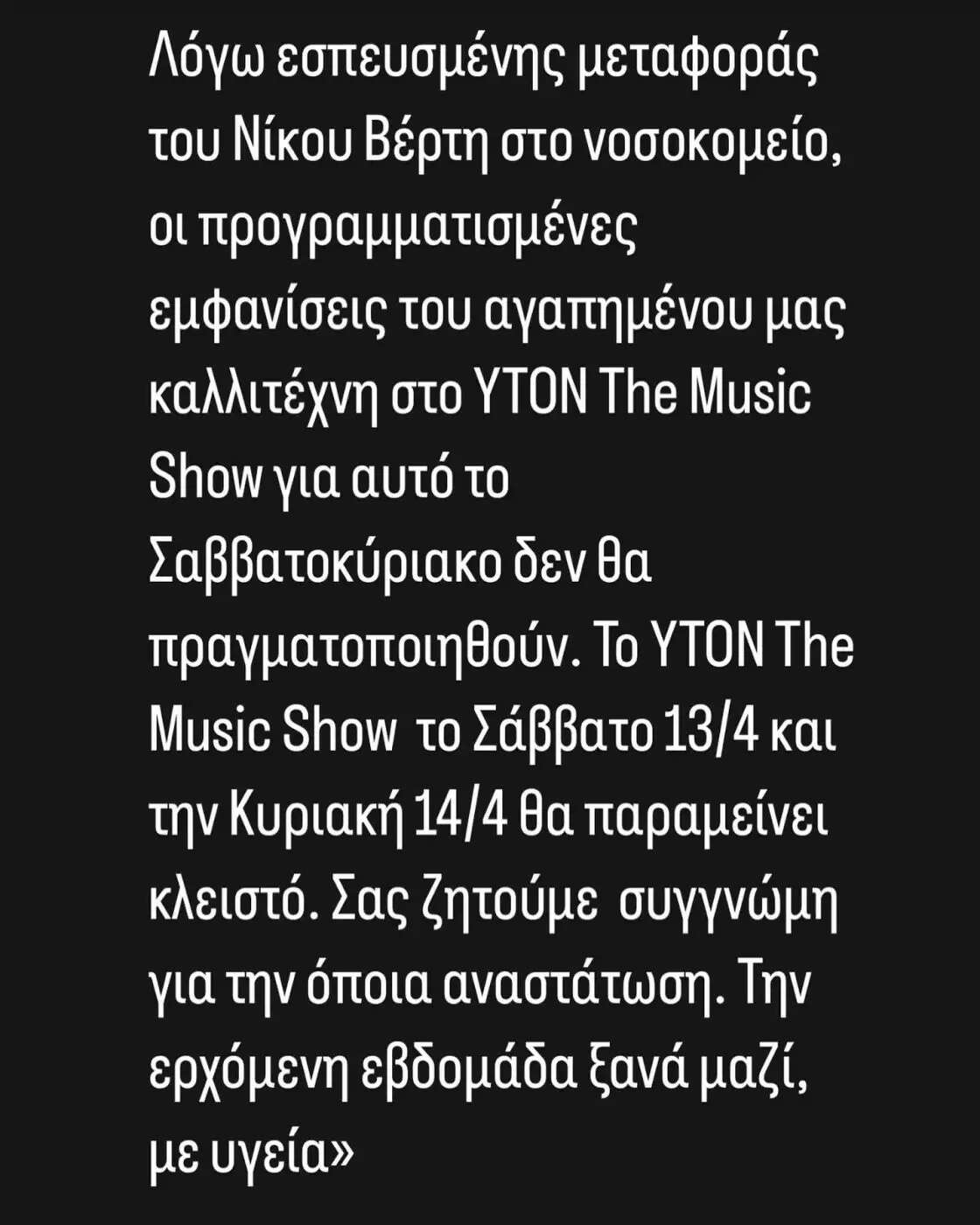 «Λόγω εσπευσμένης μεταφοράς του Νίκου Βέρτη στο νοσοκομείο, οι προγραμματισμένες εμφανίσεις του αγαπημένου μας καλλιτέχνη στο Yton The Music Show για αυτό το Σάββατο 13/4 και την Κυριακή 14/4 θα παραμείνει κλειστό. Σας ζητούμε συγγνώμη για την οποία αναστάτωση. Την ερχόμενη εβδομάδα ξανά μαζί με υγεία».