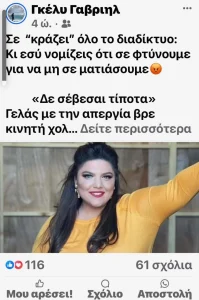 Ανάμεσα στους επικριτές της και η ηθοποιός Γκέλυ Γαβριήλ που μέσα από τον προσωπικό της λογαριασμό στο Facebook έγραψε: “Σε κράζει όλο το διαδίκτυο και εσύ νομίζεις ότι σε φτύνουμε για να μη σε ματιάσουμε. Δεν σέβεσαι τίποτα. Γελάς με την απεργία βρε κινητή χοληστερίνη; ΝΤΡΟΠΗ ΣΟΥ! Να σε χαίρονται στο κανάλι που σε έχουνε και σε πληρώνουν για να λες όλες αυτές τις χαζομάρες, αλλά δεν φταις εσύ, φταίνε οι δημόσιες σχέσεις που έχεις ξέρεις (αυτές οι καλές), κάποιοι θα καταλάβουν τι γράφω” ενώ από κάτω πολλοί ακόλουθοι έγραφαν τα δικά τους υβριστικά σχόλια και συμφωνούσαν απόλυτα μαζί της.