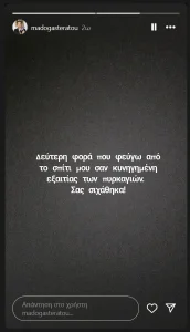 Αντιμέτωπη με νέα ταλαιπωρία βρέθηκε η έγκυος Μαντώ Γαστεράτου, λίγα 24ωρα μετά το εξιτήριο από το μαιευτήριο, αφού κλήθηκε να εγκαταλείψει το σπίτι της, λόγω φωτιάς.