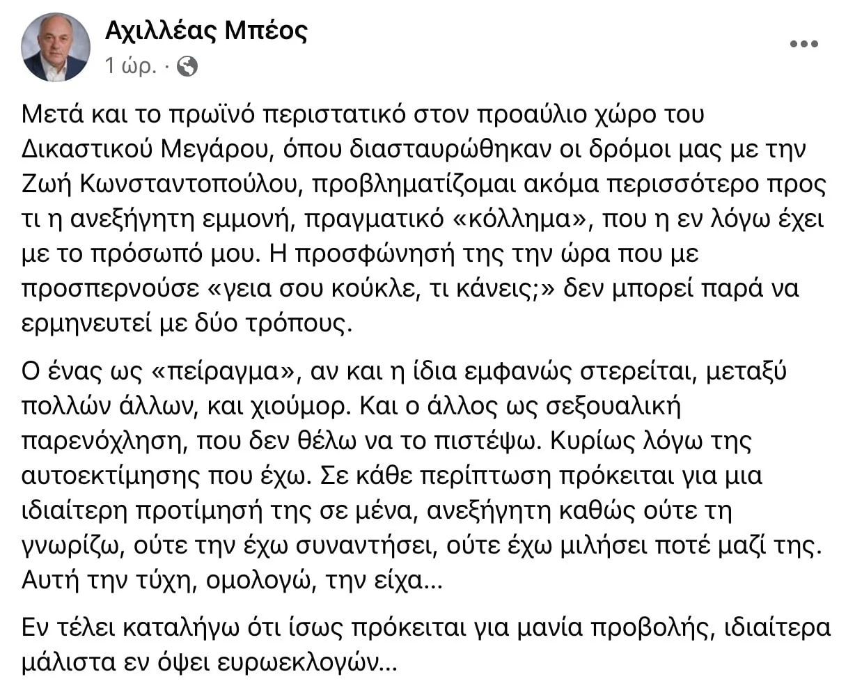 Ο δήμαρχος Βόλου, Αχιλλέας Μπέος κάνει λόγο για σεξουαλική παρενόχληση από τη Ζωή Κωνσταντοπούλου στα δικαστήρια του Βόλου και ανάρτησε τον σύντομο διάλογο που είχαν, ενώ εμφανίζεται έντονα ενοχλημένος.