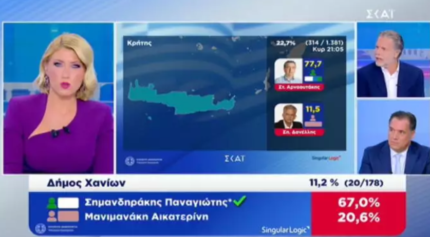 Ειδικότερα, ενώ η συζήτηση στο πλατό βρισκόταν σε εξέλιξη, ο Παύλος Γερουλάνος αναρωτήθηκε δύο φορές προς την δημοσιογράφο και παρουσιάστρια του ΣΚΑΪ: «Κάνατε την Κρήτη μπλε για κάποιο λόγο; Κάνατε την Κρήτη μπλε για κάποιο λόγο;».