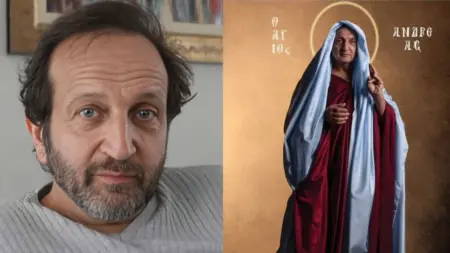 Φορώντας ένα άμφια σε βαθύ κόκκινο και ανοιχτό μπλε, ο Σπύρος Μπιμπίλας παρέστησε τον Άγιο Ανδρέα μπροστά στον φακό.