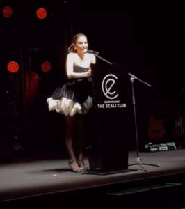 Η Εριέττα Κούρκουλου Λάτση ανέβηκε στην σκηνή για μια συγκινητική ομιλία, εκφράζοντας την υπερηφάνεια για το έργο του Save a Greek Stray. Εμφανίστηκε λαμπερή και ευδιάθετη, φορώντας ένα κομψό μαύρο φόρεμα.