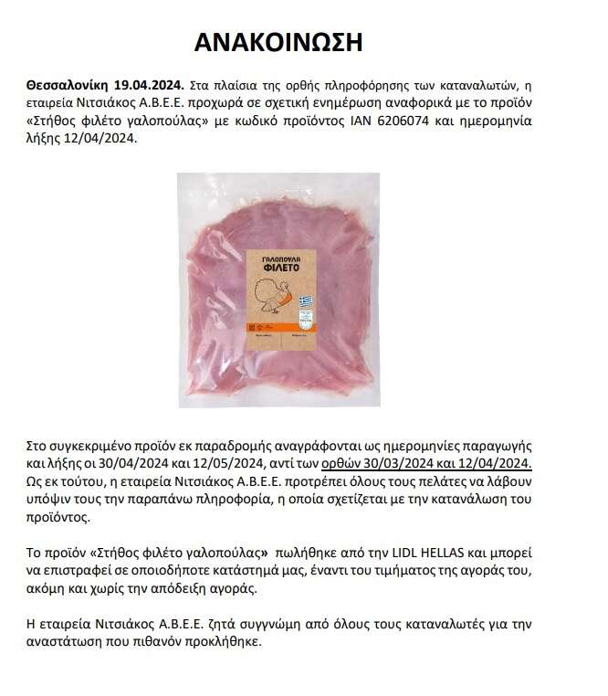 Το προϊόν «Στήθος φιλέτο γαλοπούλας» πωλήθηκε από την LIDL HELLAS και μπορεί να επιστραφεί σε οποιοδήποτε κατάστημα των σουπερμάρκετ Lidl, έναντι του τιμήματος της αγοράς του, ακόμη και χωρίς την απόδειξη αγοράς. Η εταιρεία Νιτσιάκος Α.Β.Ε.Ε. ζητά συγγνώμη από όλους τους καταναλωτές για την αναστάτωση που πιθανόν προκλήθηκε.