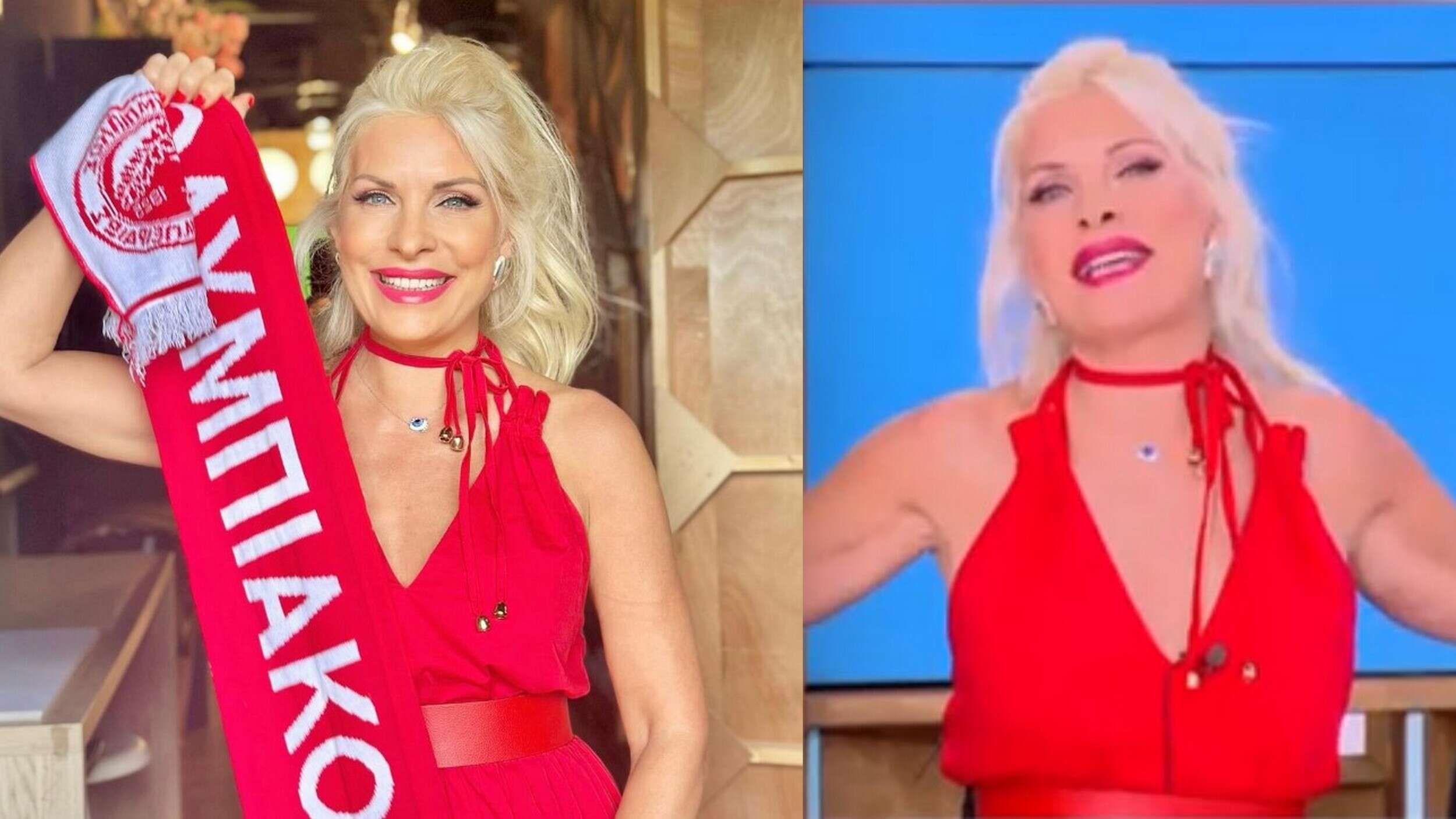 Η Ελένη Μενεγάκη εμφανίστηκε στα κόκκινα στην σημερινή εκπομπή της μετά την μεγάλη νίκη του Ολυμπιακού απέναντι στην Φιορτεντίνα.