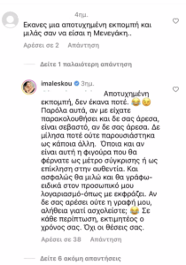 Η Ιωάννα Μαλέσκου δεν άφησε αναπάντητο το σχόλιο αυτό και έγραψε, «Αποτυχημένη εκπομπή δεν έκανα ποτέ. Παρόλα αυτά, αν με είχατε παρακολουθήσει και δε σας άρεσα, είναι σεβαστό, αν δε σας άρεσα. Δε μίλησα ποτέ, ούτε παρουσιάστηκα, ως κάποια άλλη. Όποια κι αν είναι αυτή η φιγούρα που θα φέρνατε ως μέτρο σύγκρισης ή ως επίκληση στην αυθεντία.