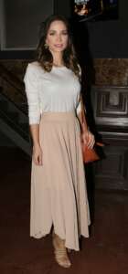 Μετά το τέλος της παράστασης, το ζευγάρι πόζαρε μαζί και θαυμάσαμε την εντυπωσιακή εμφάνιση της ηθοποιού. Η Κατερίνα επέλεξε μια μάξι πλισέ φούστα σε ένα από τα ωραιότερα χρώματα του φθινοπώρου και συνδύασε αυτό το κομψό κομμάτι με ένα λευκό μπλουζάκι και πέδιλα. Το σύνολο ολοκληρώθηκε με μια καφέ τσάντα ώμου, καθιστώντας την το επίκεντρο των βλεμμάτων.